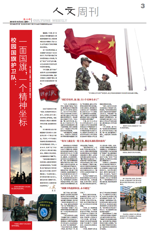 国庆假期结束了,杨康一回校就开始统计国旗护卫队新队员的队服尺码,“国旗护卫队将逐渐完成换届。每当太阳升起,国旗依然会在校园上空飘扬。”他说,国旗下的迷彩队伍会永远一起担负保卫国旗的光荣与使命。
