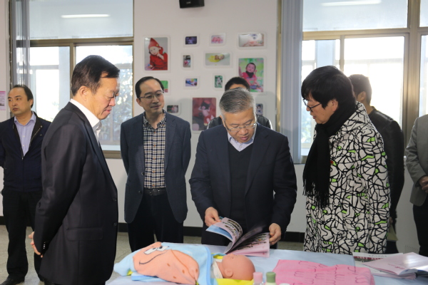徐文光一行首先来到了我校医学实训楼,参观了护理实训基地、母婴护理实训基地、老年护理基地、中药学实训基地。在母婴护理实训室,徐书记拿起月嫂培训手册仔细观看,详细了解了月嫂的培训情况,并对我校的社会培训工作给予了充分的肯定。