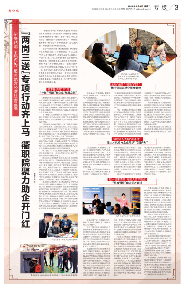 在近半年的时间里,衢职院组建了27支校级专业技术服务团队、12个校级研究所(中心),开展“两岗三送(稳岗、增岗、送技术、送培训、送服务)”专项行动,把人才链、创新链和智力链延伸到产业的最前端。老师们善谋善为,依托自身学科背景,发挥“两勤”“两专”精神,对接了一批衢州当地产业和经济社会发展的重点领域。他们沉下身子到一线,主动“坐诊”,精准“问诊”,分类施策,深耕细作服务企业所需所急,打通了一批制约企业发展的堵点卡点,为企业赋能助力,为支撑地方经济社会高质量发展,全力助推企业“开门稳”“开门红”嵌入了更多衢职元素。