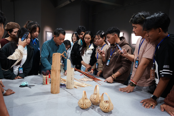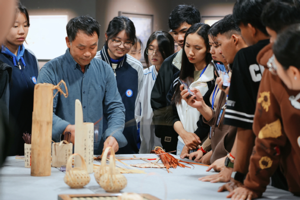 毛春良拿起一根竹条说:“同学们,竹编在中国有悠久的历史,每一根竹条都蕴含着我们祖先的智慧。”毛春良手中的竹条在灵巧地翻转、穿梭,一会儿工夫,一个精巧的竹编图案就初现雏形。留学生们目不转睛地看着,几位留学生凑上前去,仔细观察这神奇技艺。