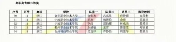 余威敏、王雪、陈蓥莹获得国家二等奖(指导教师郑淑君),戴士博、来煜圻、张雅琴获得省一等奖(指导教师胡夏朕),章庭硕、施方圆、盛怡获得省二等奖(指导老师陈淼),刘志腾、周才博、孙偕赢获得省三等奖(指导教师张有正)。